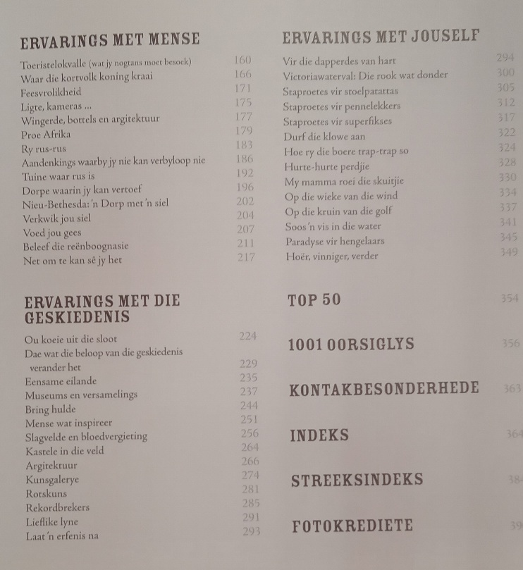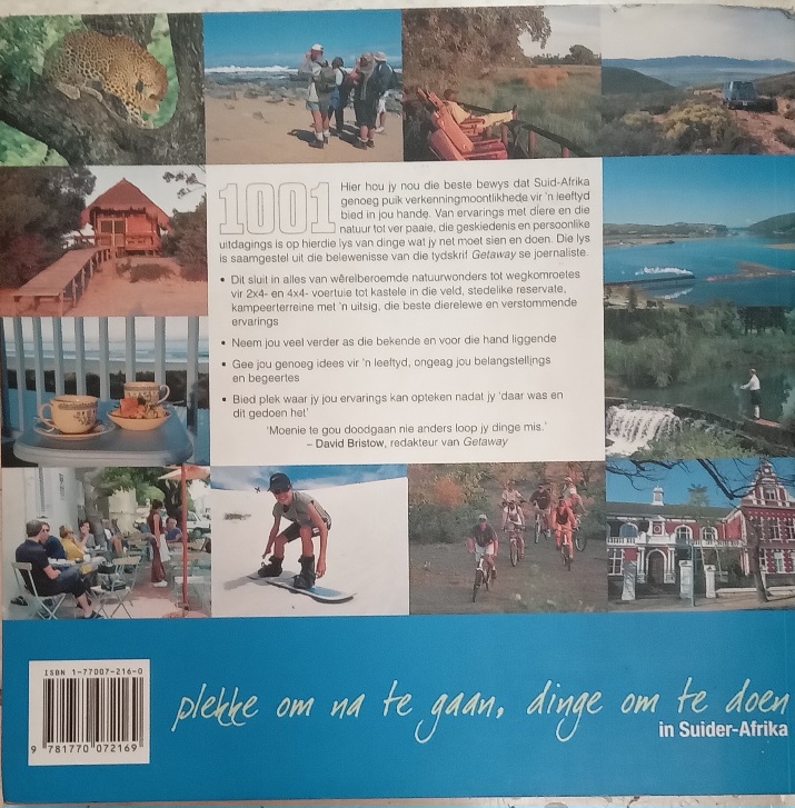 Die lys van 1001 moet-sien plekke en moet-doen dinge is saamgestel uit die ervarings Getaway tydskrif se reis joernaliste. Die titel sluit alles in, van natuur tonele wat wereld bekend is tot by ontsnappings roetes vir 2x4s en 4x4s, kastele in die veld, kampeer areas met ‘n uitsig en die beste wildlewe; die titel neem jou na plekke wat nie so bekend en voor die hand liggend is nie.