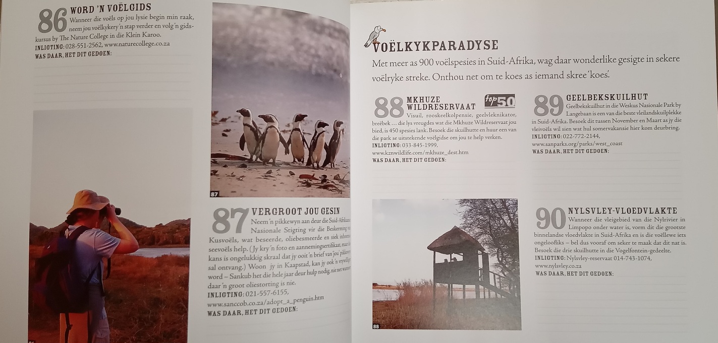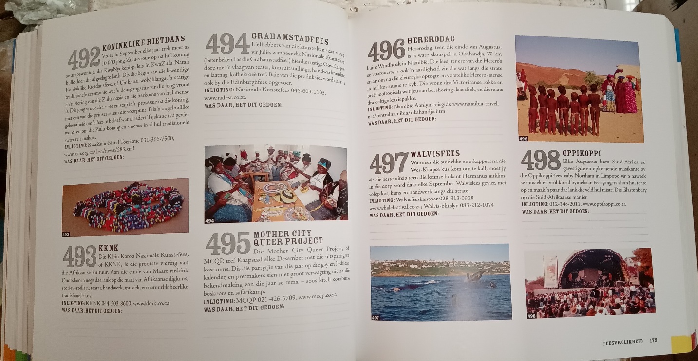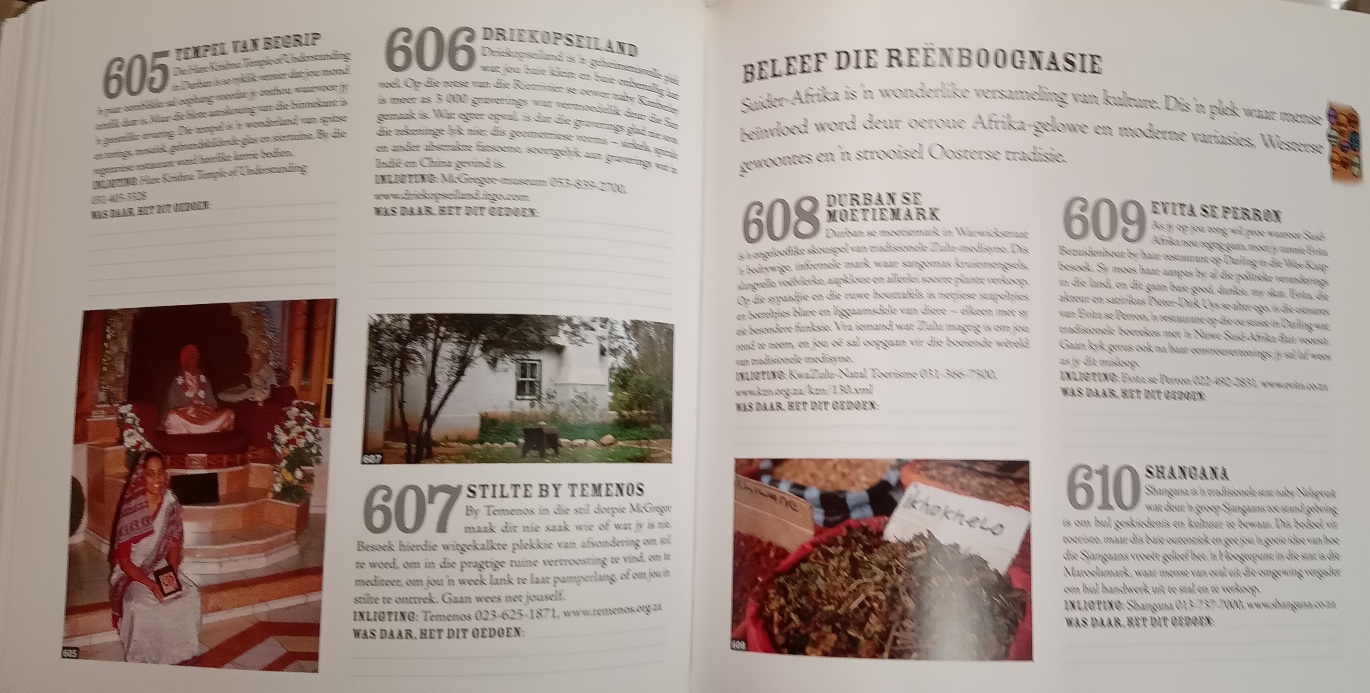 Genoeg idees vir ‘n leeftyd, ongeag jou voorkeure, belangstellings en behoeftes. Daar is spasie om te skryf oor jou eie ervarings as jy eers daar was. Onthou om jou kamera se battery te laai en die fles koffie in te pak!