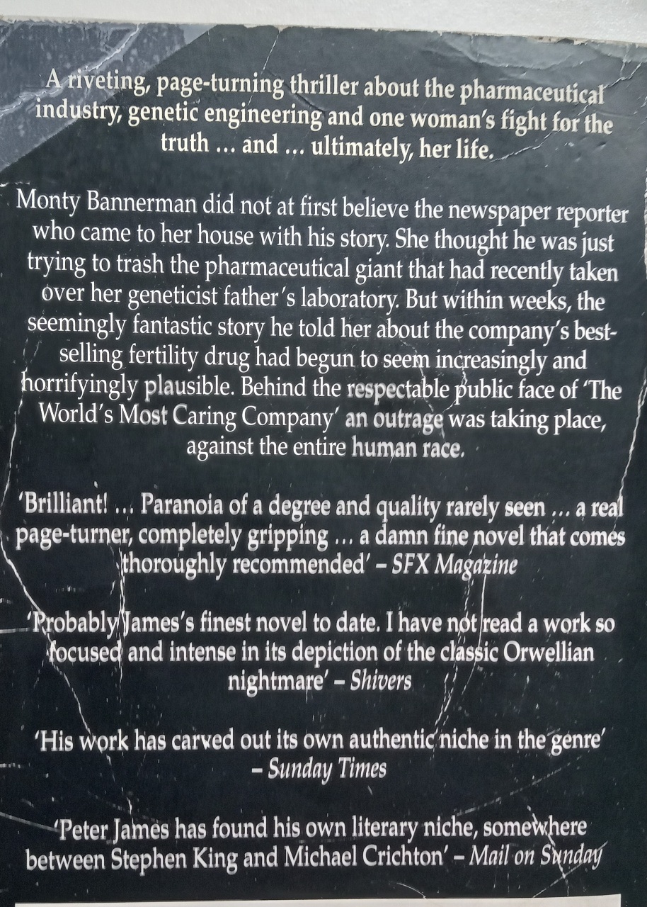 Monty Bannerman’s father is a leading genetic scientist who has just been seduced into joining what will shortly be the world’s biggest pharmaceuticals giant, despite some misgivings about their company ethics. He needs their money, they need his mind. But when Monty stumbles upon a fertility drug trial that is killing women and producing terribly deformed babies it looks like they have unwittingly sold themselves to the devil.