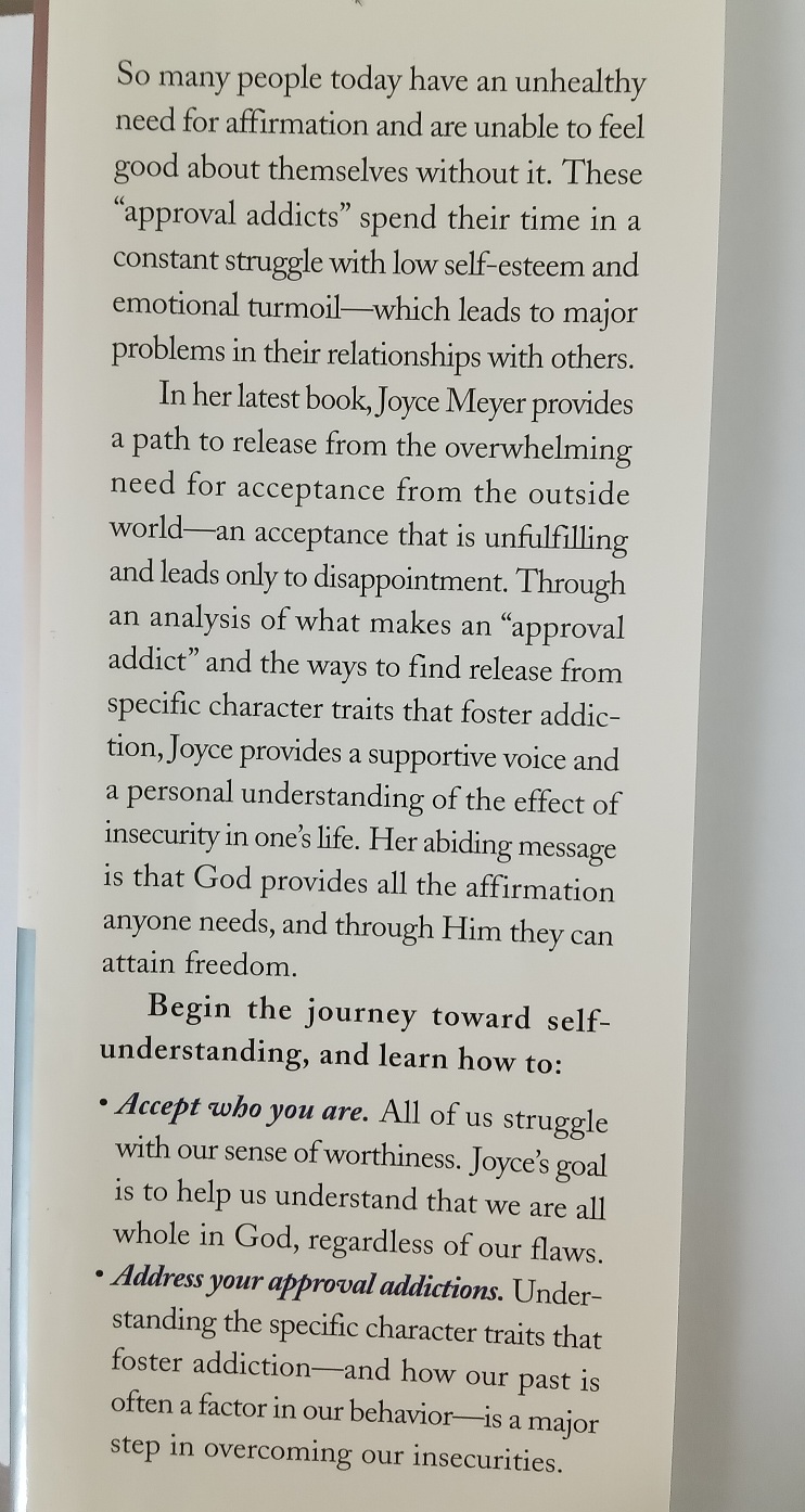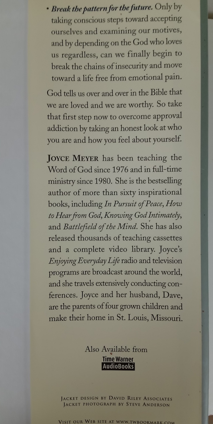Joyce Meyer understands the need for seeking approval from others to overcome feelings of rejection and low self-esteem. The good news, she says, is that there is a cure. God provides all the security anyone needs. Her goal is to provide a pathway toward freedom from the approval addiction.