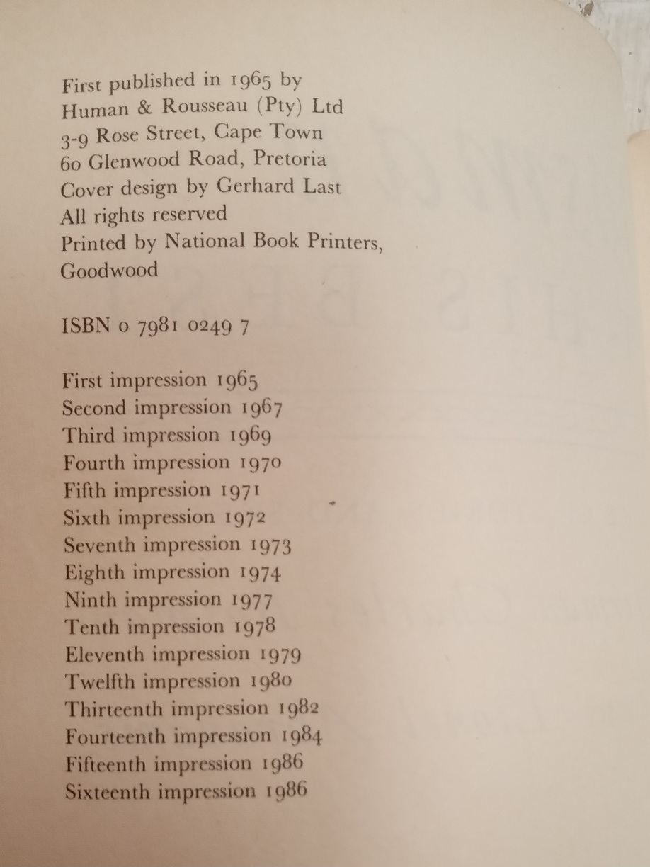 Publisher: Human & Rousseau, Cape Town & Pretoria.