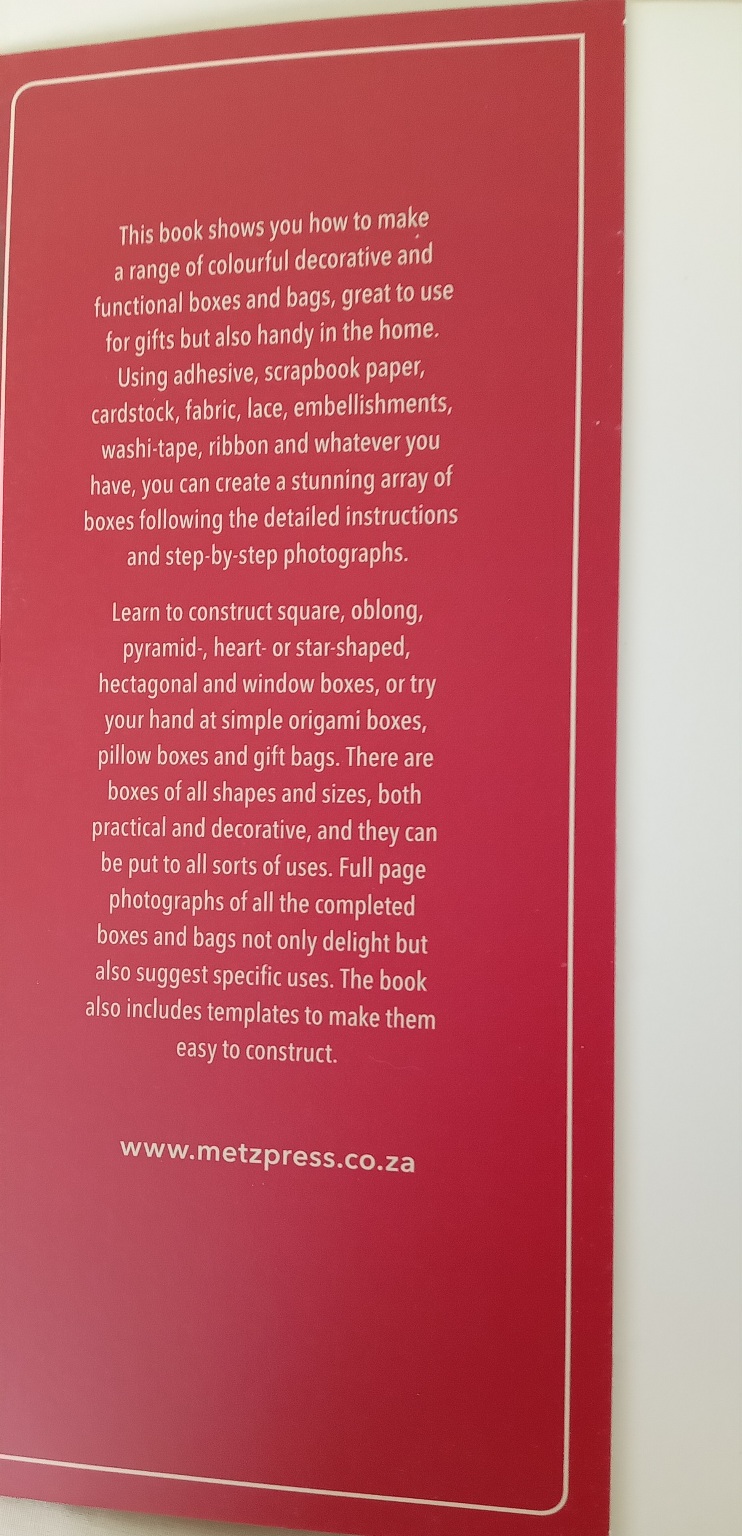 Learn to construct square, oblong, pyramid-, heart- or star-shaped, hectagonal and window boxes, or try your hand at simple origami boxes, pillow boxes and gift bags. There are boxes of all shapes and sizes, both practical and decorative, and they can be put to all sorts of uses.
