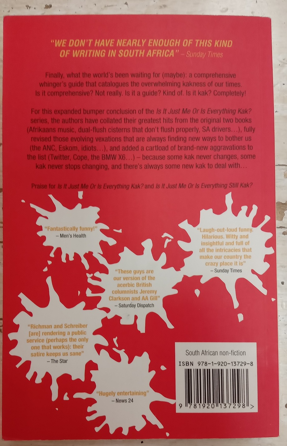 For those who loved South Africa’s original Is It Just Me Or Is Everything Kak? books of 2007 and 2008, Complete Kak! was the expanded bumper conclusion of the series, released in 2009. In it the authors collated their greatest hits from the original two books (Afrikaans music, dual-flush, idiots…), and added a cartload of brand-new aggravations to the list (Twitter, Cope, the BMW X6…).