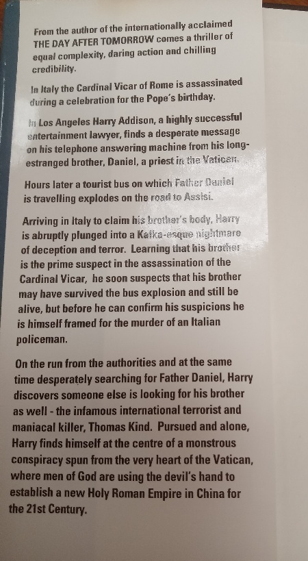After the phenomenal success of THE DAY AFTER TOMORROW, Allan Folsom has created another dazzling thriller of heart-stopping action involving a chillingly credible int’l conspiracy. The Addison brothers, Harry & Danny, have been estranged for many years, but when Danny calls from Rome pleading for Harry to get in touch, his brother doesn’t ignore him. Except it seems he is too late, as Danny was on board a tourist bus which was blown apart by a bomb. But when Harry arrives in Italy he is plunged into a Kafka-esque nightmare, discovering that his brother is accused of assassinating the Cardinal Vicar of Rome and when he dares to suggest that Danny is still alive he finds that someone is willing to frame him for murder before he can start to clear Danny’s name. Alone and vulnerable in a foreign country, Harry is sucked into the maelstrom of a conspiracy in the heart of the Vatican, where men of God are using the devil’s hand to further the influence of the Catholic Church. A tense and absorbing thriller.
