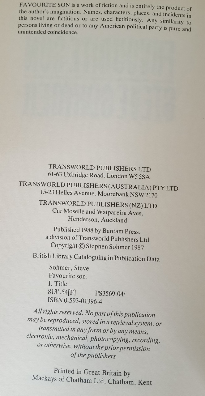 (Favourite Son is a miniseries about political intrigue that aired on NBC in three parts from October 30 to November 1, 1988, a week before that year’s presidential election. It starred Harry Hamlin, Linda Kozlowski, James Whitmore, Robert Loggia, John Mahoney, Ronny Cox, and Jason Alexander. The miniseries was adapted from the 1987 novel of the same written by Steve Sohmer, who also wrote the teleplay.)