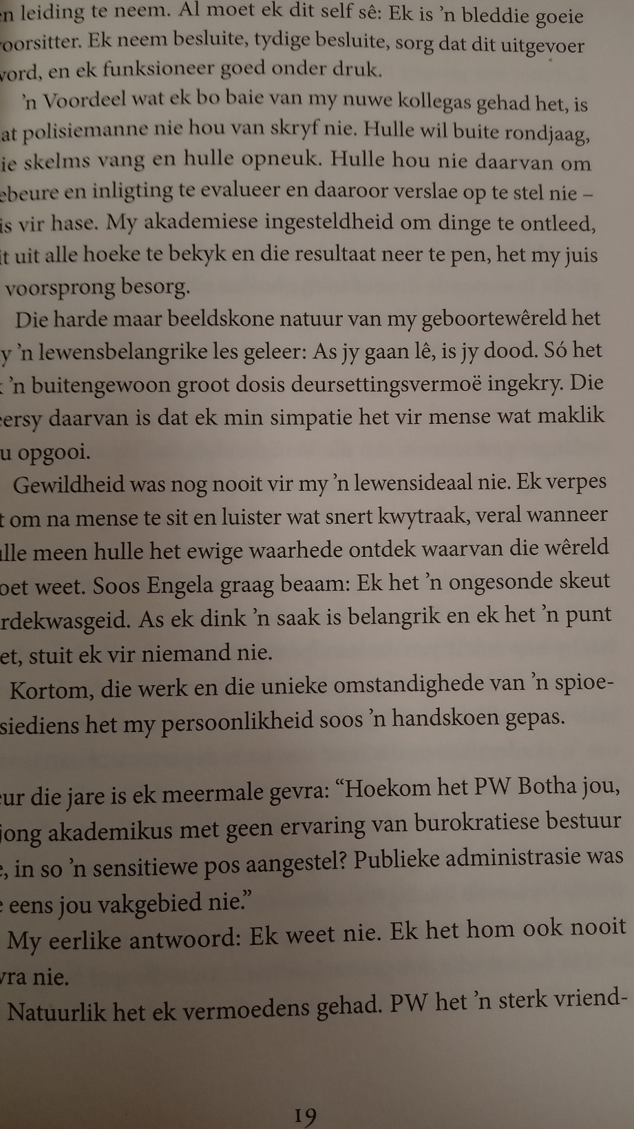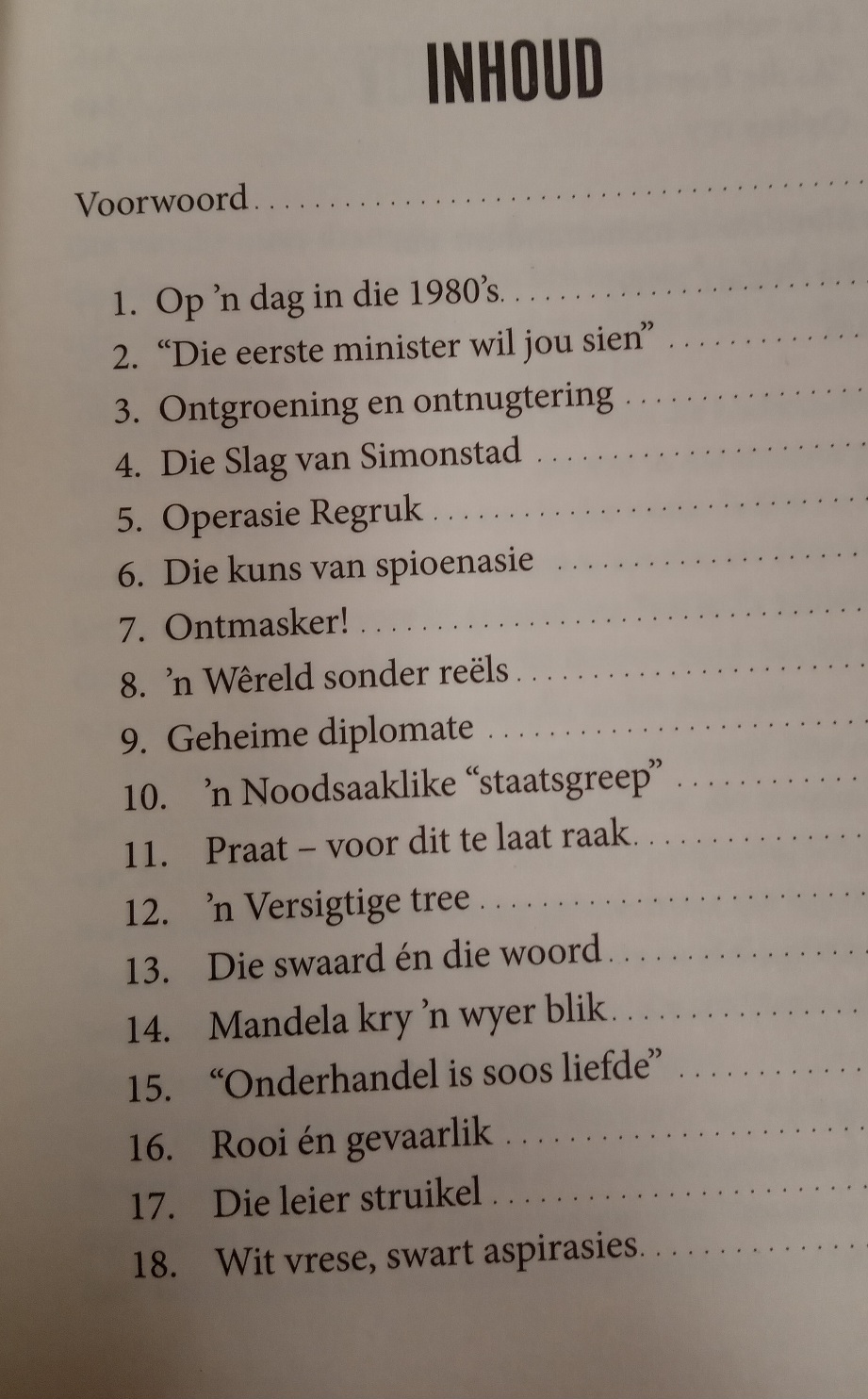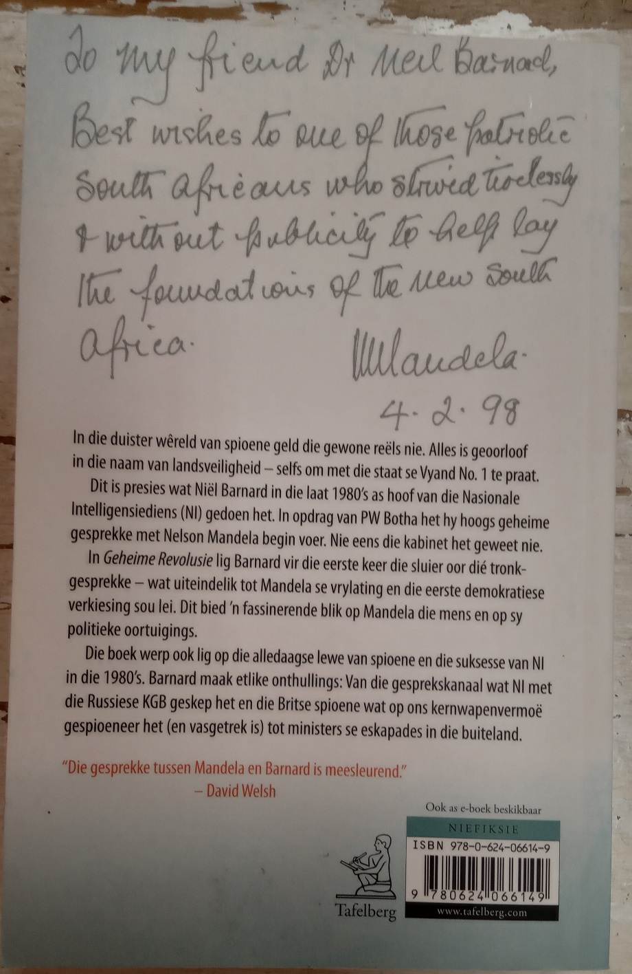 Dit bied ‘n fassinerende blik op Mandela die mens en op sy politieke oortuigings. Die boek werp ook lig op die alledaagse lewe van spioene en die suksesse van NI in die 1980’s. Barnard maak etlike onthullings: Van die gesprekskanaal wat NI met die Russiese KGB geskep het en die Britse spioene wat op ons kernwapenvermoë gespioeneer het (en vasgetrek is) tot ministers se eskapades in die buiteland.
