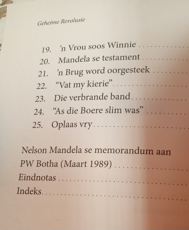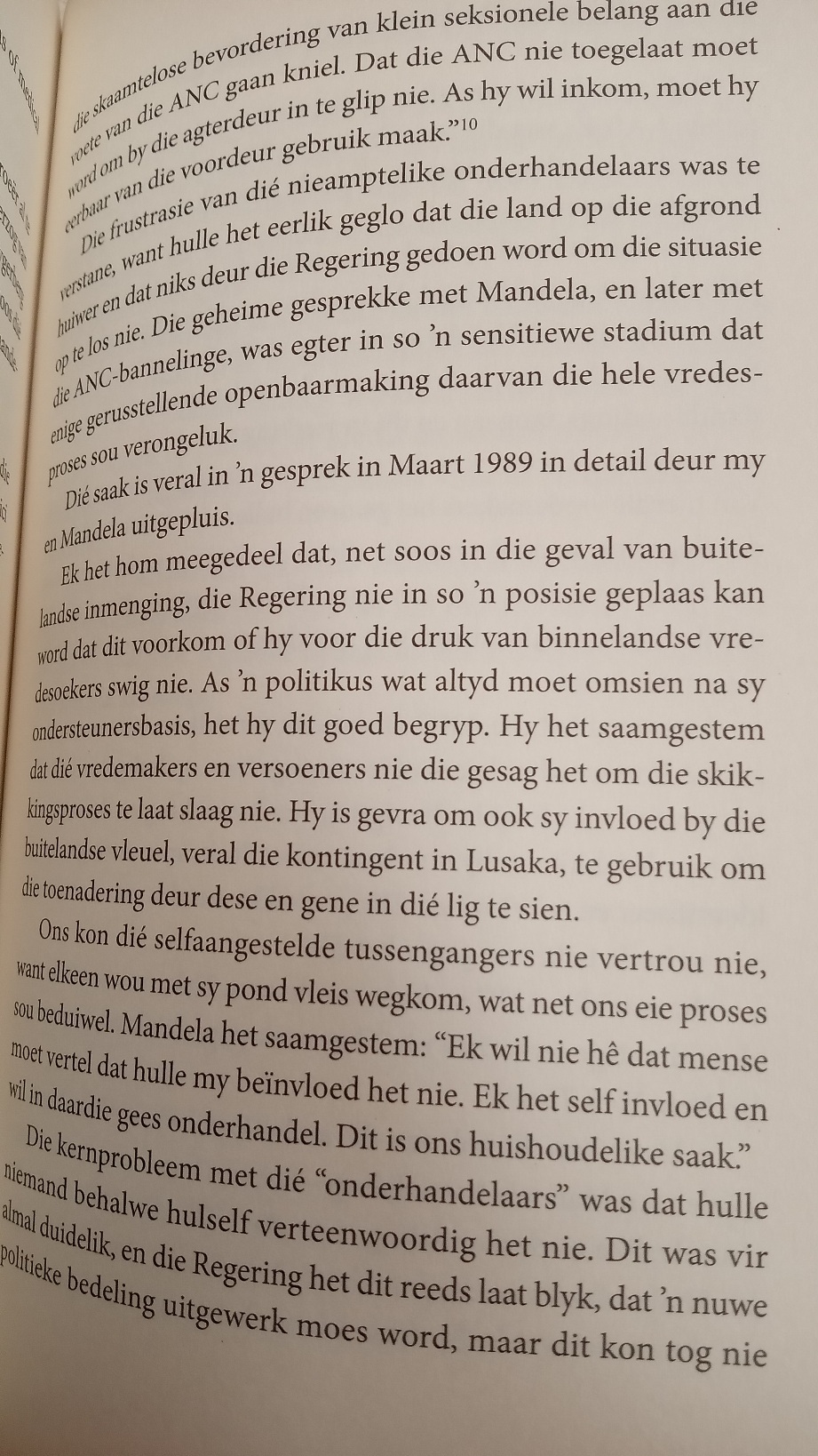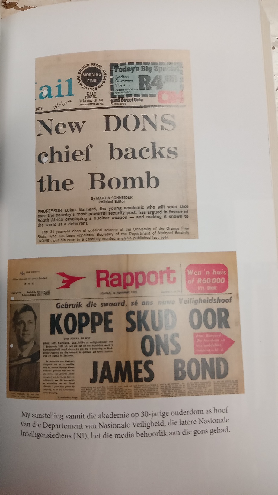 Dit bied ‘n fassinerende blik op Mandela die mens en op sy politieke oortuigings. Die boek werp ook lig op die alledaagse lewe van spioene en die suksesse van NI in die 1980’s. Barnard maak etlike onthullings: Van die gesprekskanaal wat NI met die Russiese KGB geskep het en die Britse spioene wat op ons kernwapenvermoë gespioeneer het (en vasgetrek is) tot ministers se eskapades in die buiteland.