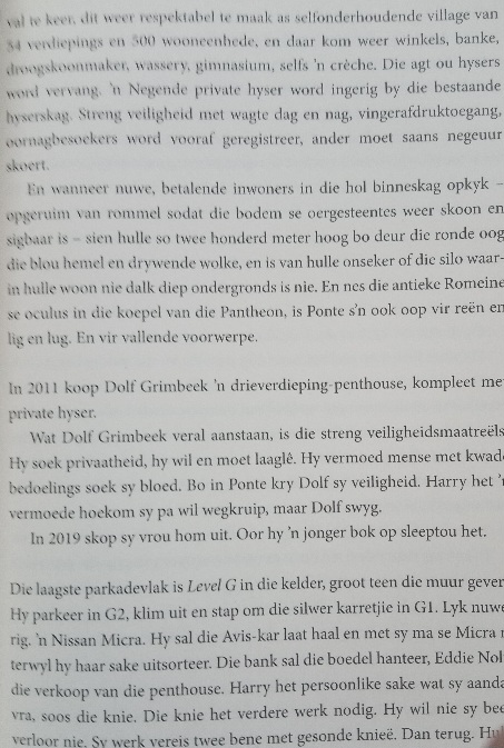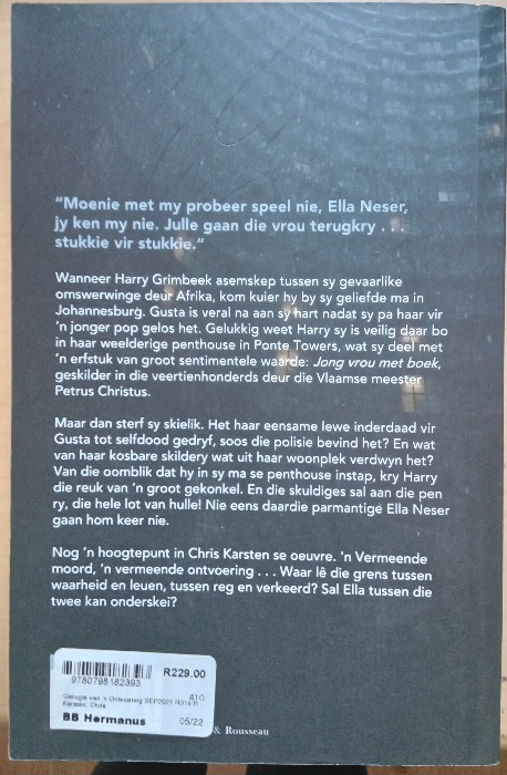 Wanneer Harry asemskep tussen sy omswerwinge deur Afrika, kom kuier hy by sy geliefde ma in Johannesburg. Gusta is veral na aan sy hart ná sy pa haar vir ’n jonger pop gelos het. Gelukkig weet Harry sy is veilig daar bo in haar luukse penthouse in Ponte Towers.Teen die tyd dat Harry in Oos-Afrika opgespoor word, is sy ma al dae lank dood. Harry kry die reuk van ’n groot gekonkel. Nie eens daai parmantige Ella Neser gaan hom keer nie. Nog ’n hoogtepunt in Chris Karsten se Ella Neser