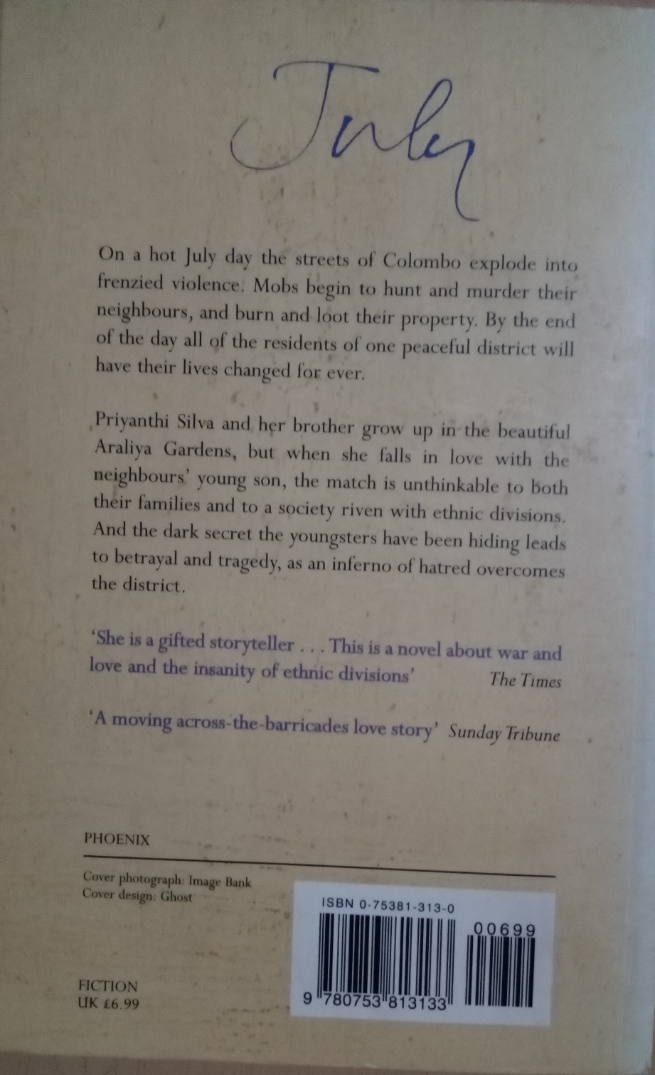 Priyanthi Silva is born in Sri Lanka into a peaceful, loving Sinhalese family, but into a turbulent country dogged by religious and political tensions. She and her brother Hemantha grow up in Araliya Gardens, a tropical paradise full of orchids and mango trees. Their neighbours are Christian Tamils whose gentle, handsome son Niranjan is Hemantha’s best friend. When Priyanthi is older, the two families spend a holiday together, and by the time they return home Priyanthi and Niranjan have fallen in love. But it is an unthinkable match to both their families, and to a society riven with ethnic divisions. On a hot July day that year the streets of Colombo explode into frenzied violence as mobs begin to hunt and murder Tamils and burn and loot their property. The dark secret Priyanthi and Niranjan have been hiding leads to betrayal and tragedy, as an inferno of hatred overcomes their peaceful neighbourhood.