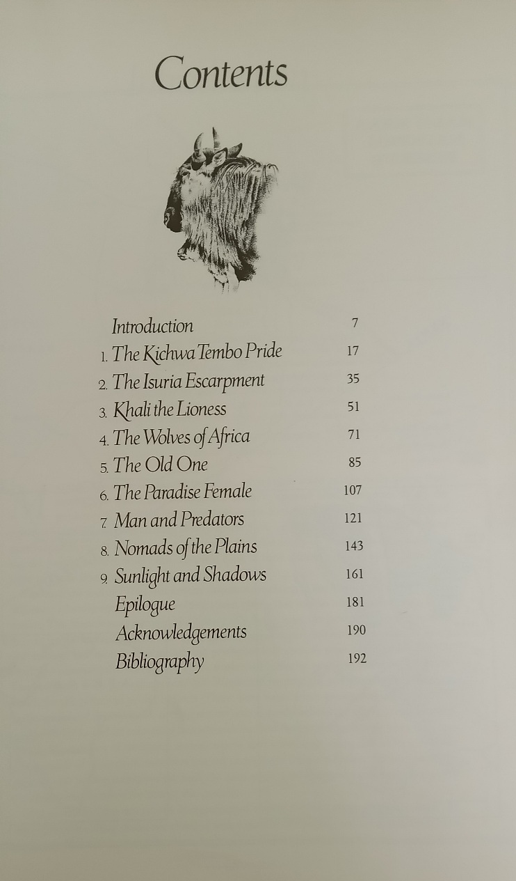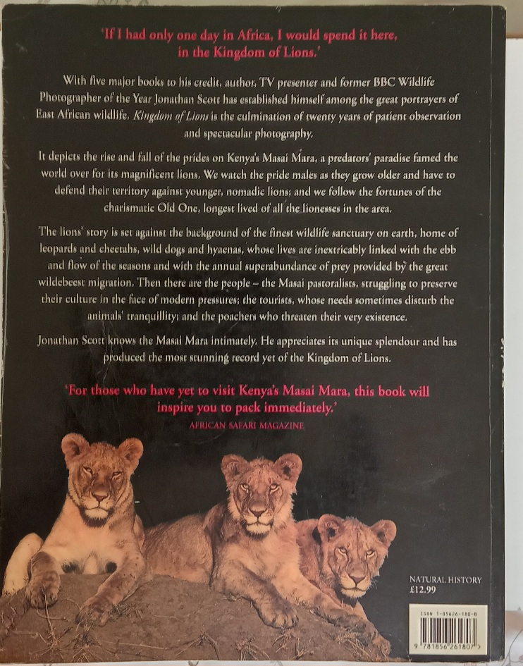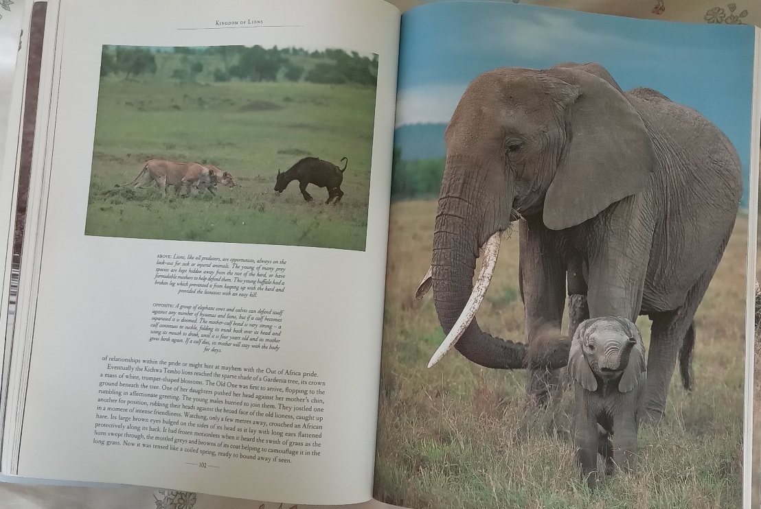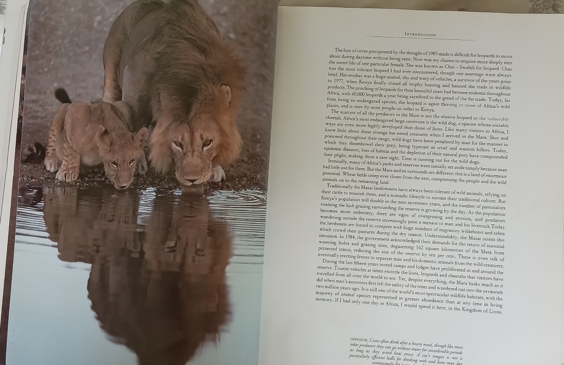 It follows the fortunes of assorted lion prides and other animals, such as leopards,wild dogs, cheetahs, elephants and the vast herds of buffalo, wildebeest and gazelles etc. He has spent many years in the Masai Mara, the eponymous Kingdom of Lions, and he describes the daily lives of the lions in a delightful way, amply aided by some beautiful photographs and pencil sketches .