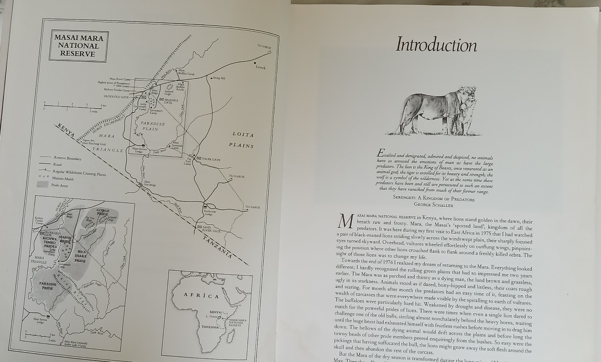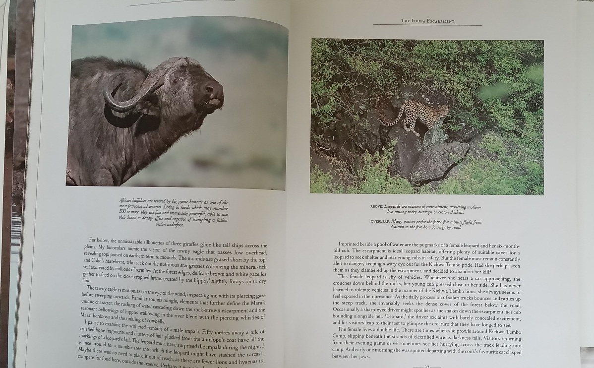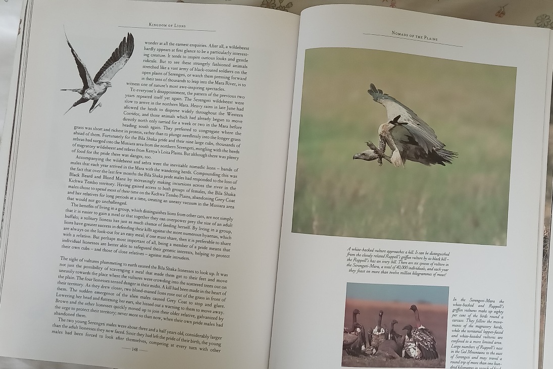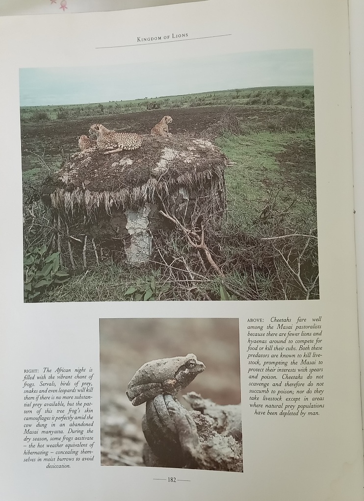 It follows the fortunes of assorted lion prides and other animals, such as leopards,wild dogs, cheetahs, elephants and the vast herds of buffalo, wildebeest and gazelles etc. He has spent many years in the Masai Mara, the eponymous Kingdom of Lions, and he describes the daily lives of the lions in a delightful way, amply aided by some beautiful photographs and pencil sketches .
