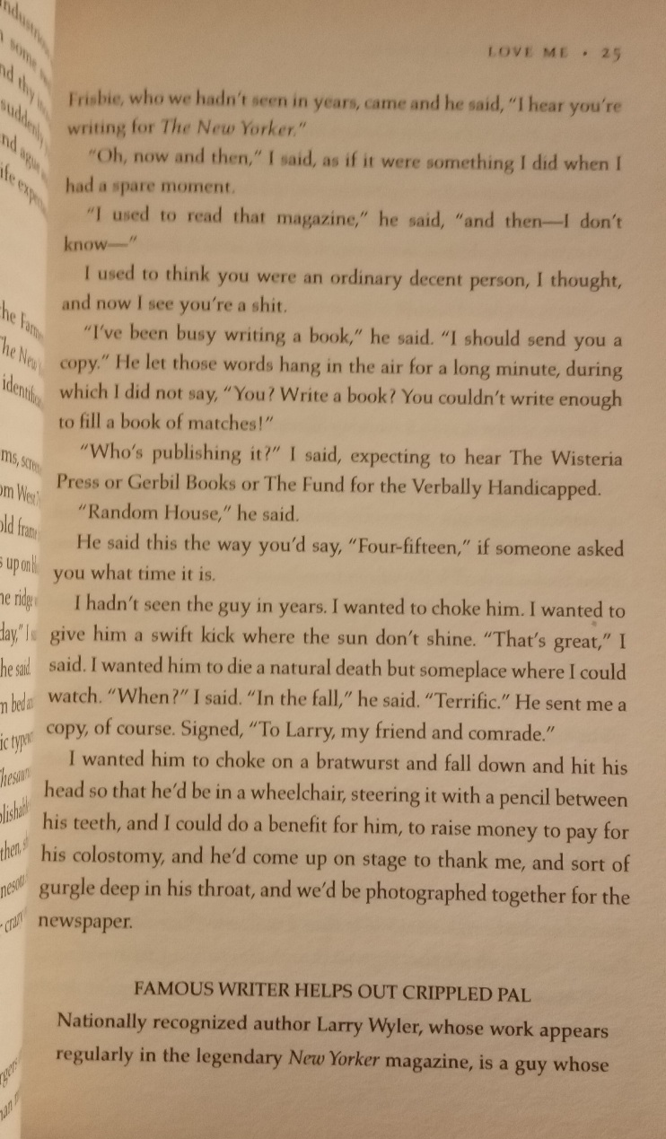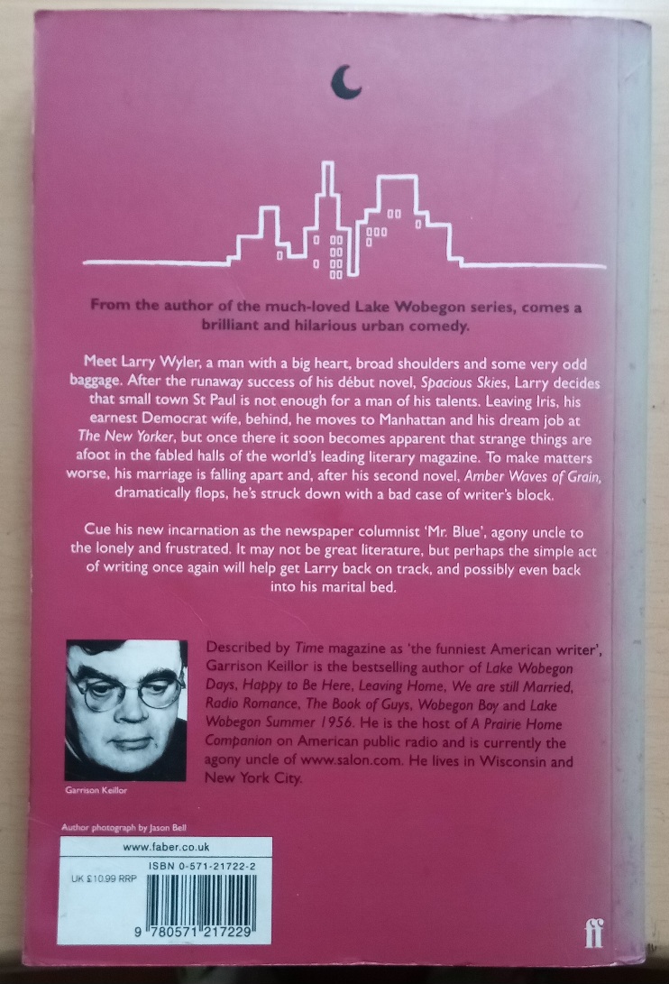 Love Me is a humorous novel by Garrison Keillor about aspiring writer :Larry Wyler, who finds sudden success with a bestseller, leaves his wife Iris, and moves to New York; only to face writer’s block and lose his way before rediscovering what truly matters through writing an advice column, “Ask Mr. Blue,” and seeking to win Iris back.