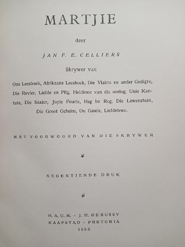 Ek dank my landgenote vir die aanmoediging en ondersteuning, en hoop dat ‘Martjie’ by toeneming sal bydra tot die doel wat ons beoog: opbou van taal, kuns, nasionaliteit.