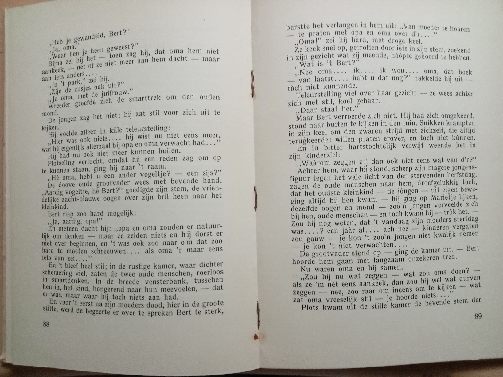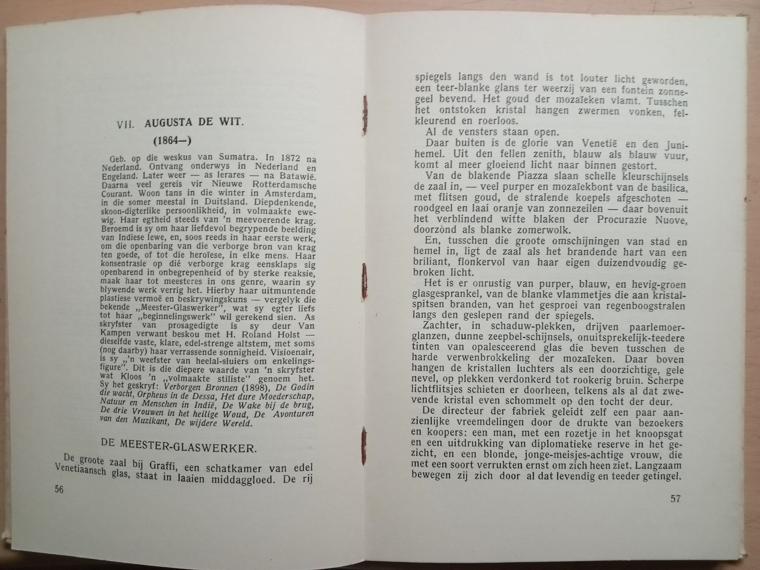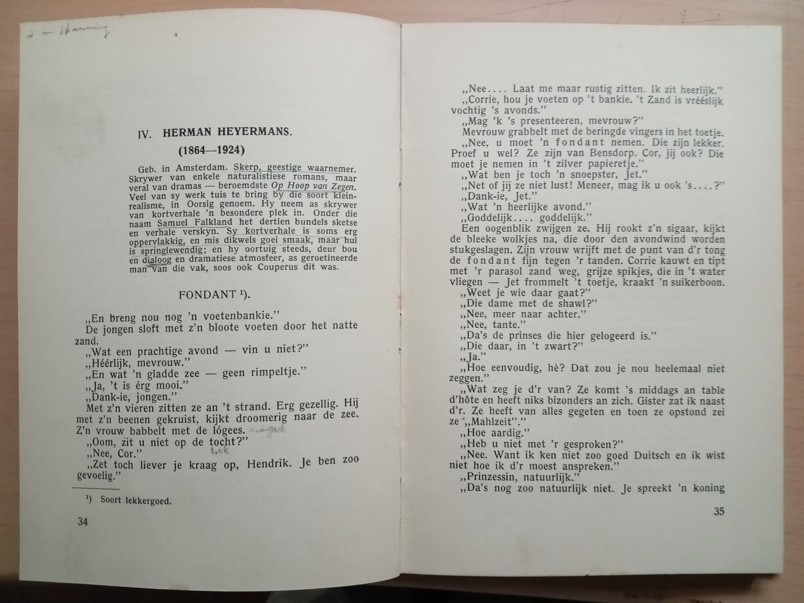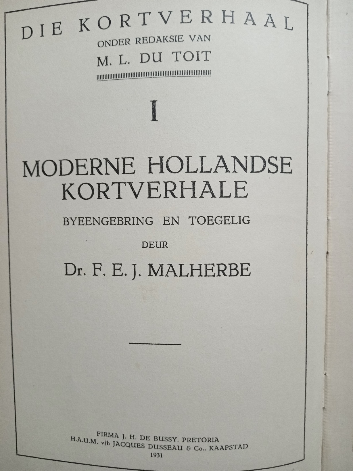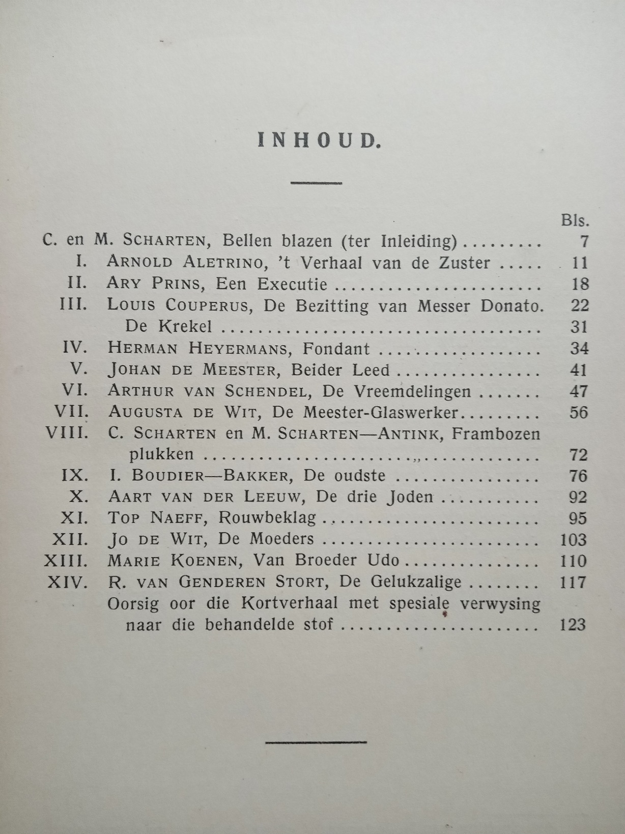 DIS die eerste deel van ‘n serie wat glo uit ‘n twaalf dele sal bestaan. Daarin sal opgeneem word ‘n keur uit die kortverhale van die verskillende letterkundes. Die Nederlandse en Vlaamse deeltjies verskyn in die oorspronklike tale; al die ander sal in Afrikaans vertaal word. Dis ongetwyfeld ‘n kostelike idee, want veral nou dat daar so baie oor kuns en kultuur gepraat en alles in die werk gestel word om ons nasie-bewus te maak, behoort so’n serie ons eie saak uitstekende dienste te bewys. Daardeur sal ‘n groot deel van die leserspubliek vertroud raak met die beste uit ander letterkundes, dikwels wêreldletterkundes, en om die eie na behore te waardeer, maar veral om die eie op te bou, mag die buitelandse nooit uit die oog verloor word nie. Dit betaam ‘n jong volkie, ‘n doelbewus-strewende volkie, om waar nodig sy lampie by groter volke aan te steek. Dis ‘n slim volk wat uit die ondervinding van ander volke kan leer. Klaklose en hol navolging mag dit nie word nie. Die hele serie staan onder redaksie van dr. M.L. du Toit en die samesteller van hierdie deel is dr. F.E.J. Malherbe van Stellenbosch. Laasgenoemde het ook gesorg vir die biografiese en ander besonderhede en ‘n ‘oorsig oor die kortverhaal met spesiale verwysing naar die behandelde stof.’ Die boekies is in die eerste plek seker bedoel vir die persoon wat iets goeds wil lees en in kort bestek die kenmerkende eienskappe van verskillende letterkundes, soos dit in die kort-verhaal tot uiting kom, wil aantref. Ook vir die ernstige student sal hierdie boeke van groot waarde wees en dis veral vir hulle wat die kort maar saaklike ‘oorsig’ van dr. Malherbe bedoel is. Ek kan nie sê dat die ‘Voorwoord’ van die algemene redakteur my danig getref het nie. Dit behoort tog vir ons nie nodig te wees om so half-en-half verskoning te vra dat die eerste bundeltjie in Nederlande verskyn nie. Miskien is dit veral vir die groot-publiek bedoel. Dr. Malherbe het die stukke uit die Nederlandse letterkunde van na 1880 gekies. Dit spreek vanself dat sy groot moeilikheid beperking was. Holland het in die afgelope halfeeu uitstekende skrywers voortgebring. Dit val ook saam met die opkoms van die kort-verhaal en skets in die Nederlandse letterkunde. Almal sal en kan daarom nie ooral saamstem met die |