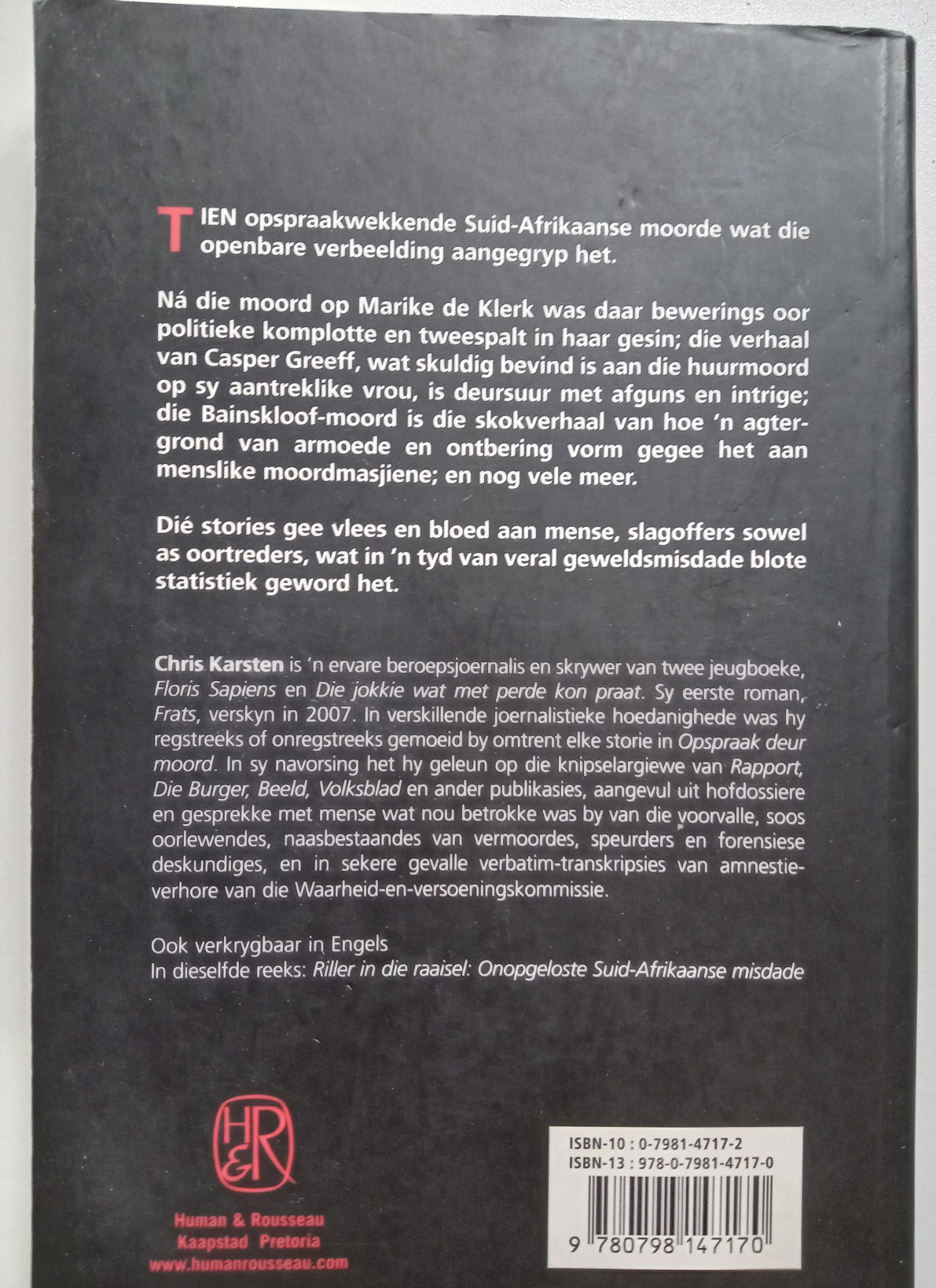 Tien spannende verhale van opspraakwekkende moorde, met heelwat besonderhede wat nog nie rugbaar was toe die stories die media vol was nie. Met Marike de Klerk se moord was daar die bewerings oor politieke komplotte en tweespalt in haar gesin; die verhaal van Casper Greeff, wat skuldig bevind is aan die huurmoord op sy aantreklike vrou, is omring met afguns en intrige; die Bainskloof-moord is die skokverhaal van hoe ‘n agtergrond van armoede en kindermishandeling vorm gegee het aan menslike moordmasjiene; en nog vele meer. Die moorde is gekies op grond van die buitengewone boeiende inhoud van die gebeure en hul potensiaal vir nuwe, nuuswaardige onthullings.