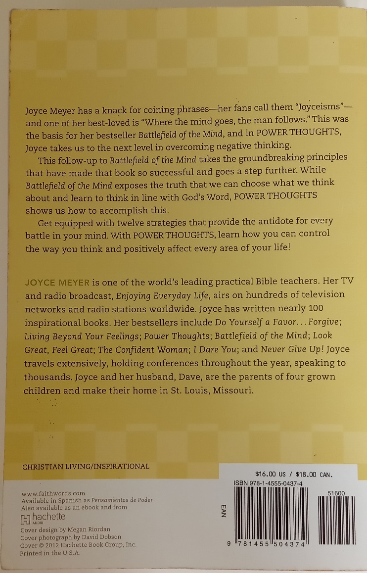 Joyce Meyer has a knack for coining phrases-her fans call them “Joyceisms”-and one of her best loved is “Where the mind goes, the man follows.” This was the basis for Battlefield of the Mind , and in her latest book, Meyer provides “power thoughts,” bringing the reader to a new level of ability to use the mind as a tool to achievement.