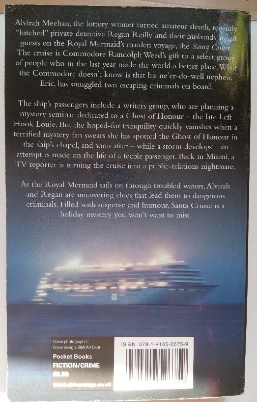 Alvirah Meehan, the lottery winner turned amateur sleuth, and her husband Willy, private detective Regan Reilly, her new husband Jack, and Regan’s parents are all guests on the Royal Mermaid’s maiden voyage, the Santa Cruise. The ship’s passengers include members of the Oklahoma Readers and Writers group – who are planning a mystery seminar dedicated to a Ghost of Honour, the late Left Hook Louie – as well as assorted other charitable folk all planning on a restful post-Christmas vacation. What the guests don’t know is that two escaping criminals have been smuggled on board. The hoped-for tranquility quickly vanishes when a terrified mystery fan swears she has spotted the Ghost of Honour in the ship’s chapel, and soon after – while a storm develops outside – an attempt is made on the life of a feeble passenger. As the Royal Mermaid sails on through troubled waters, Alvirah, Regan and Jack are uncovering clues that lead them to dangerous criminals.