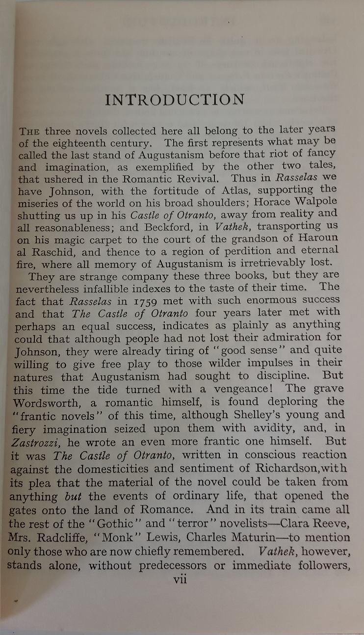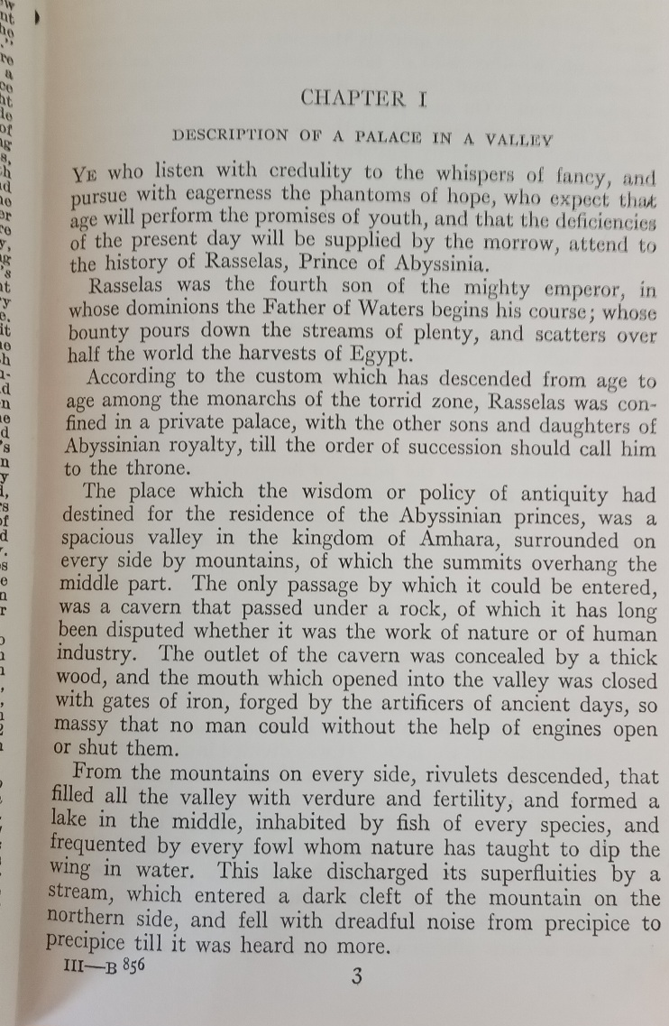 This volume offered readers key examples of 18th-century fiction, focusing on philosophical quests, Gothic horror, and Oriental fantasy, with Rasselas itself following a prince searching for happiness from his secluded “Happy Valley”.