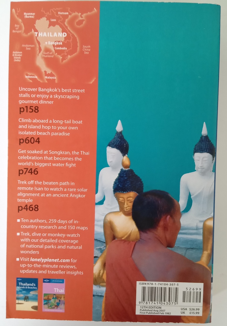 The Lonely Planet Thailand 2007 edition (ISBN 978-1741043075), also known as the 12th edition, offering extensive travel info on Thailand’s culture, transport, and destinations, a staple for budget travelers.