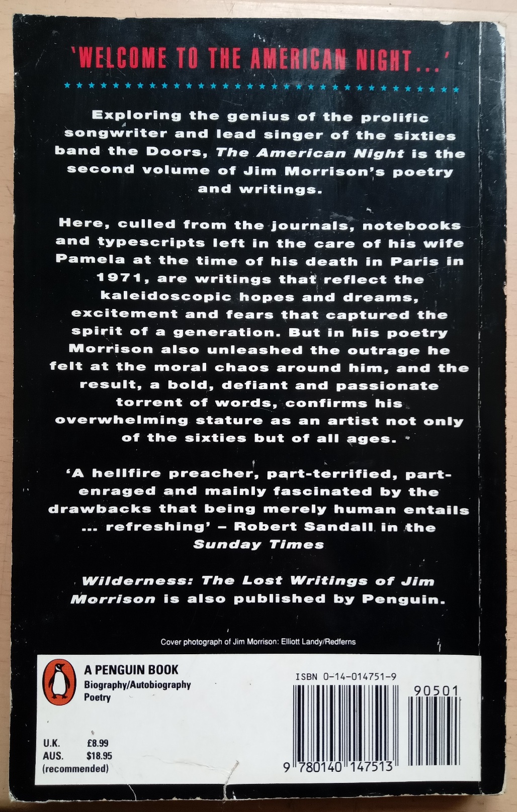 The American Night presents Morrison’s previously unpublished work in its truest form. The book includes the complete text of the legendary performance pieces “An American Prayer,” “Celebration of the Lizard,” and “Soft Parade”; the lyrics so such songs as “Moonlight Drive,“ ”Soul Kitchen,” and “The End”; a tantalizing excerpt from an unproduced screenplay called “The Hitchhiker”; and poems culled from Morrison’s journals. With their nightmarish images, bold associative leaps, and volcanic power of emotion, these works are the unmistakable artifacts of a great, wild voice and heart.