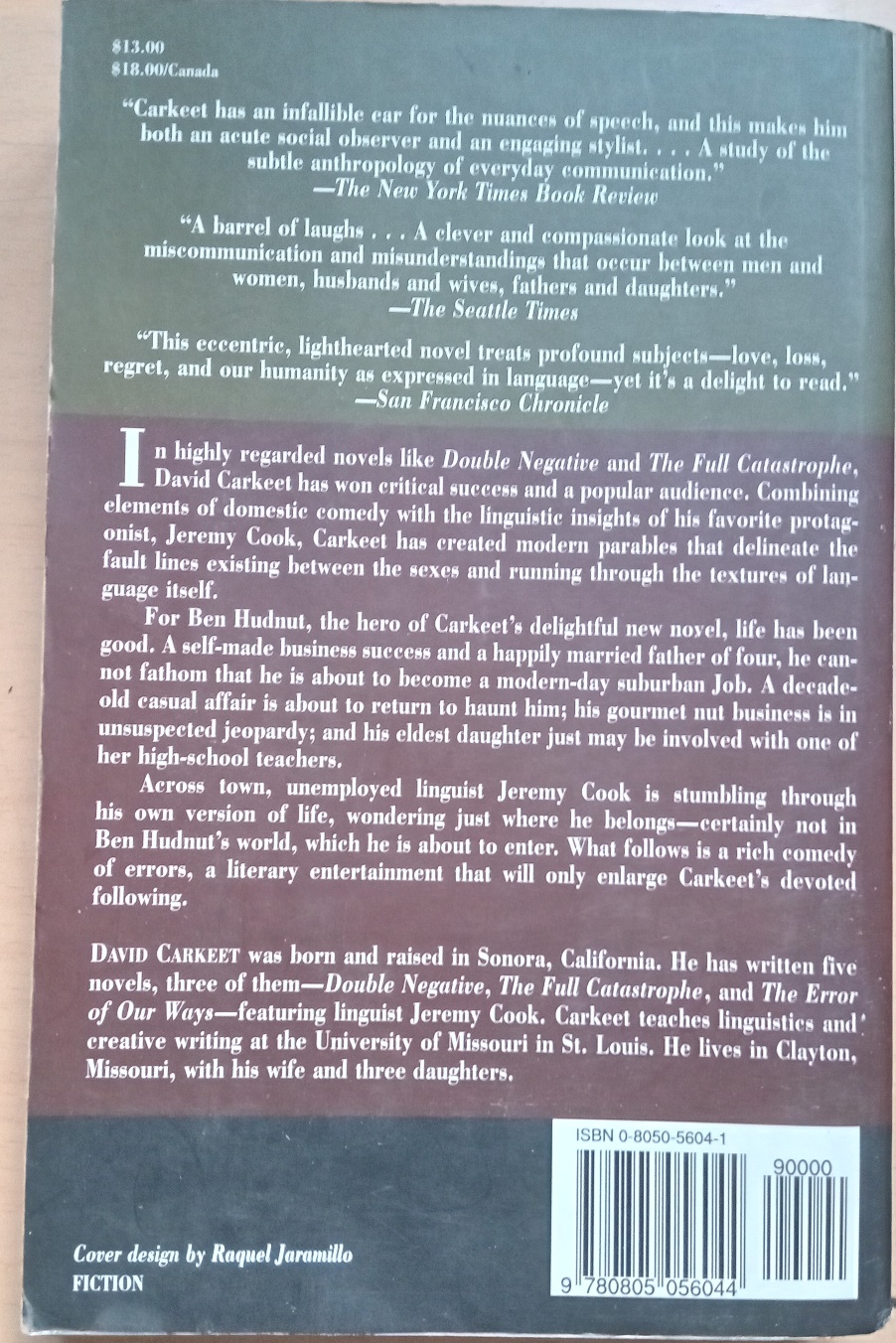 Across town, unemployed linguist Jeremy Cook is stumbling through his own version of life, wondering just where he belongs – certainly not in Ben Hudnut’s world, which he is about to enter. What follows is a rich comedy of errors, a literary entertainment that will only enlarge Carkeet’s devoted following.
