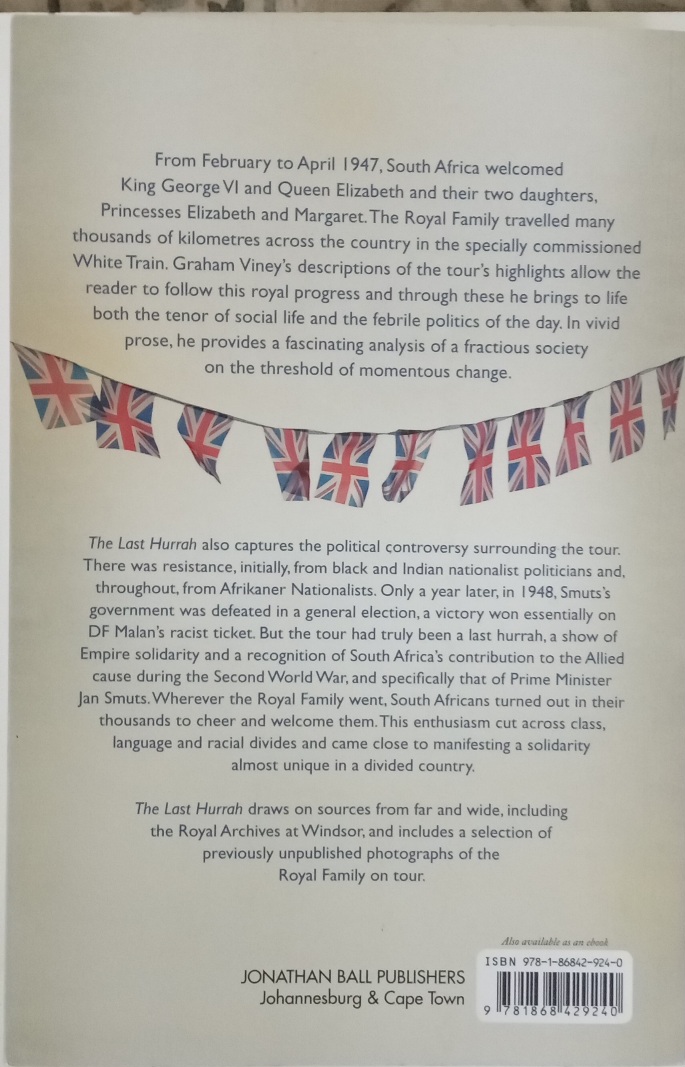 In The Last Hurrah, Graham Viney has written a fascinating account of a pivotal moment in South African history. In vivid prose he describes the background to the Royal Tour and its progress across the country in the specially commissioned white train. More than this, Viney provides interesting analysis of the politics of the time and the society, fractious as ever, which welcomed King George VI and Queen Elizabeth and their two daughters, Princesses Elizabeth and Margaret.