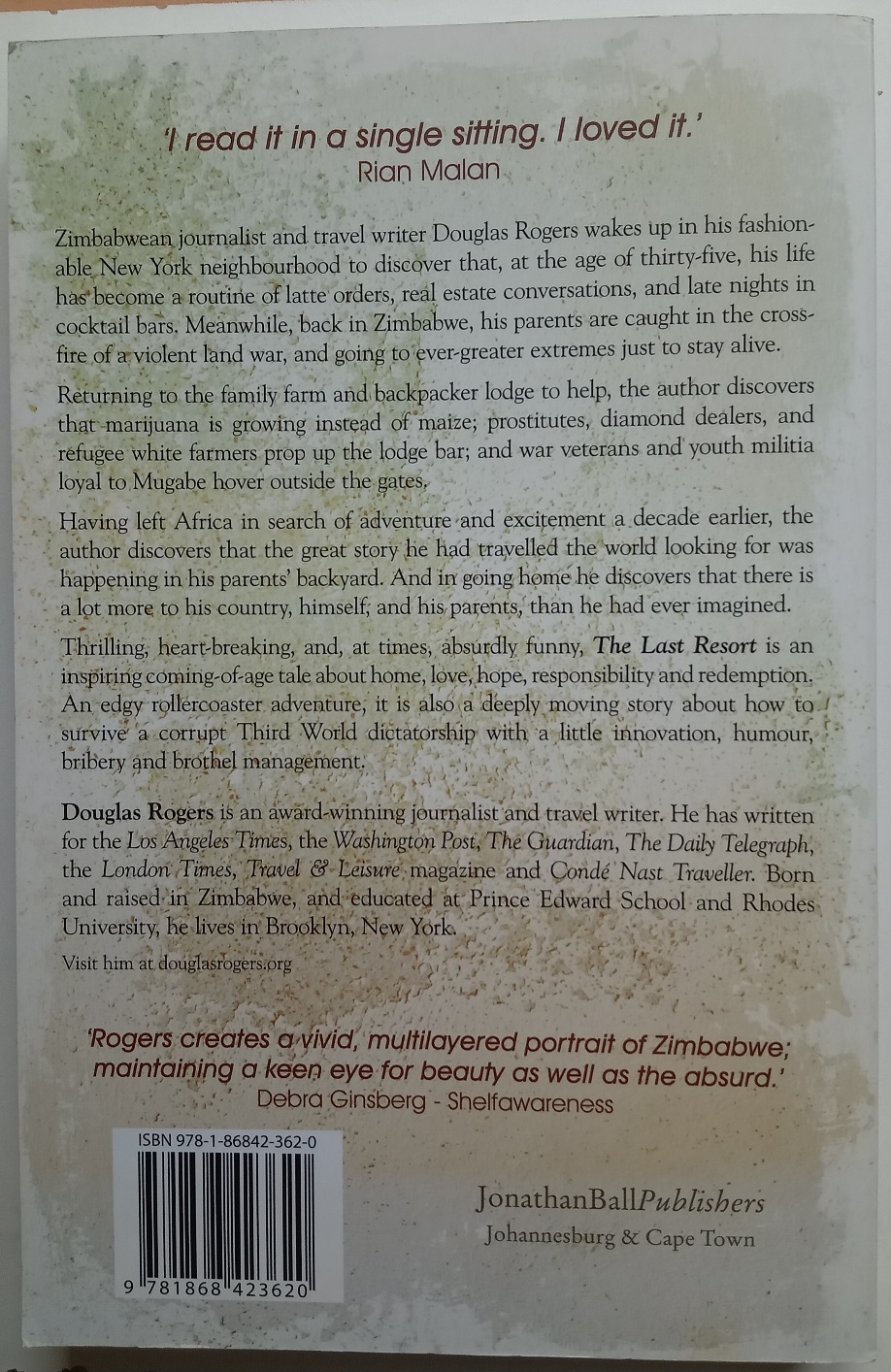 Born and raised in Zimbabwe, Douglas Rogers is the son of white farmers living through that countrys long and tense transition from postcolonial rule. He escaped the dull future mapped out for him by his parents for one of adventure and excitement in Europe and the United States. But when Zimbabwes president Robert Mugabe launched his violent program to reclaim white-owned land and Rogerss parents were caught in the cross fire, everything changed. Lyn and Ros, the owners of Driftersa famous game farm and backpacker lodge in the eastern mountains that was one of the most popular budget resorts in the countryfound their home and resort under siege, their friends and neighbors expelled, and their lives in danger. But instead of leaving, as their son pleads with them to do, they haul out a shotgun and decide to stay.