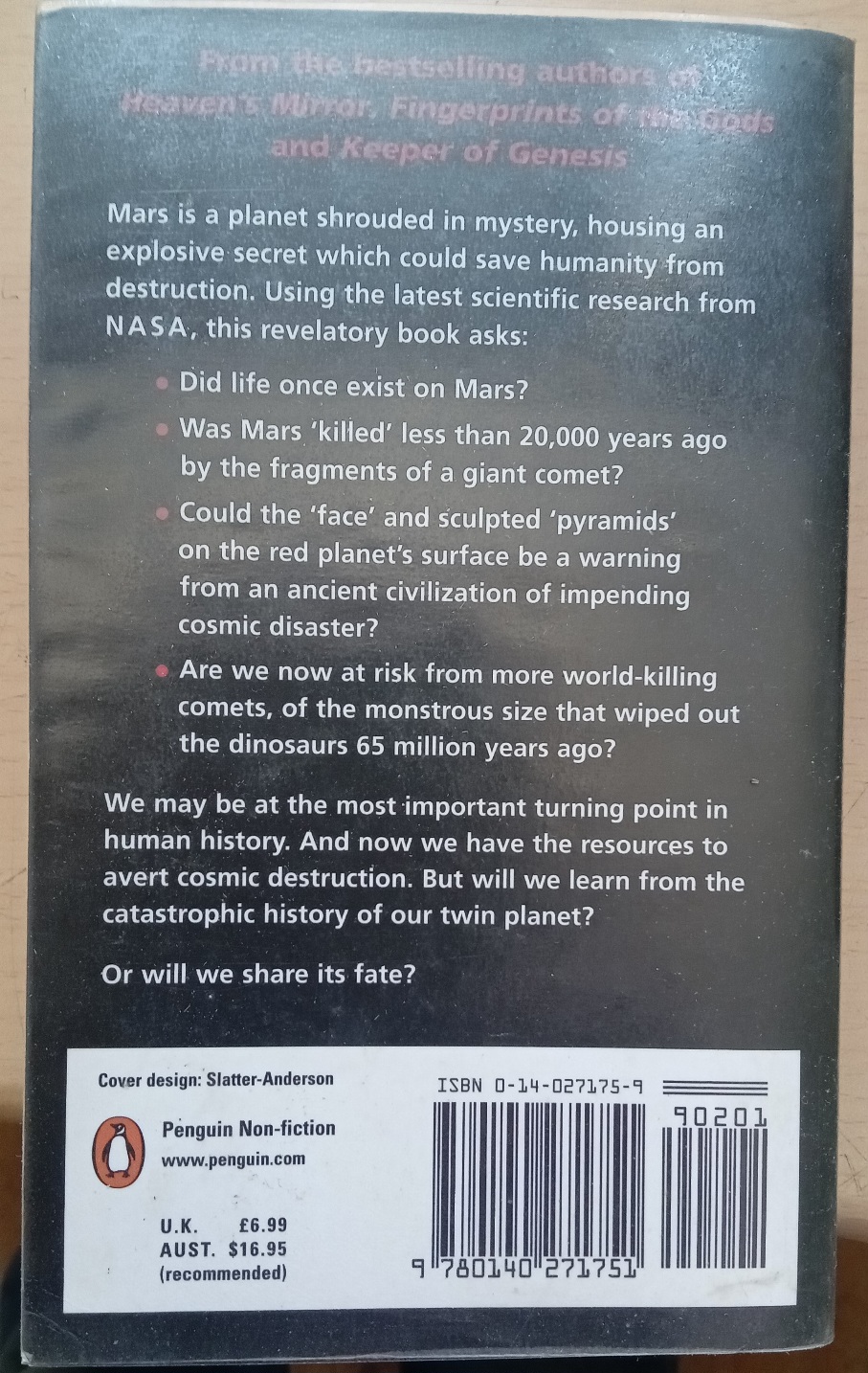 In his most riveting and revealing book yet, Graham Hancock examines the evidence that the barren Red Planet was once home to a lush environment of flowing rivers, lakes, and oceans. Could Mars have sustained life and civilization?