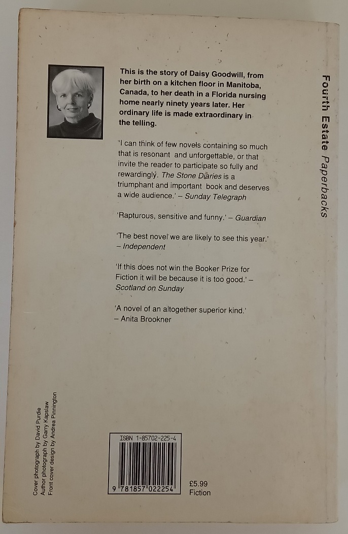 The Stone Diaries is one ordinary woman’s story of her journey through life. Born in 1905, Daisy Stone Goodwill drifts through the roles of child, wife, widow, and mother, and finally into her old age. Bewildered by her inability to understand her place in her own life, Daisy attempts to find a way to tell her story within a novel that is itself about the limitations of autobiography. Her life is vivid with incident, and yet she feels a sense of powerlessness.