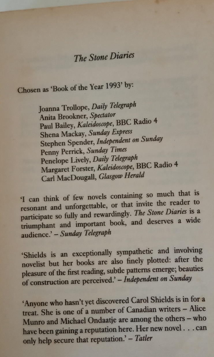 Daisy’s struggle to find a place for herself in her own life is a paradigm of the unsettled decades of our era. A witty and compassionate anatomist of the human heart, Carol Shields has made distinctively her own that place where the domestic collides with the elemental. With irony and humor she weaves the strands of The Stone Diaries together in this, her richest and most poignant novel to date.