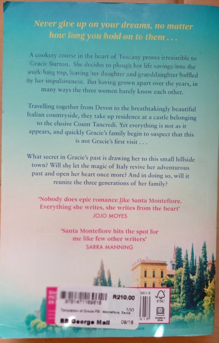 Then Gracie stumbles upon an advertisement for a weeklong cookery course in the heart of the Tuscan countryside. She cannot resist and ploughs her life savings into the trip. Carina and Anastasia accompany her. They have no idea why Gracie has been drawn to this venture. They have no sense of her past; she has never spoken about it. They have no idea that Gracie is harbouring the secret of an extraordinary life that preceded them . . .