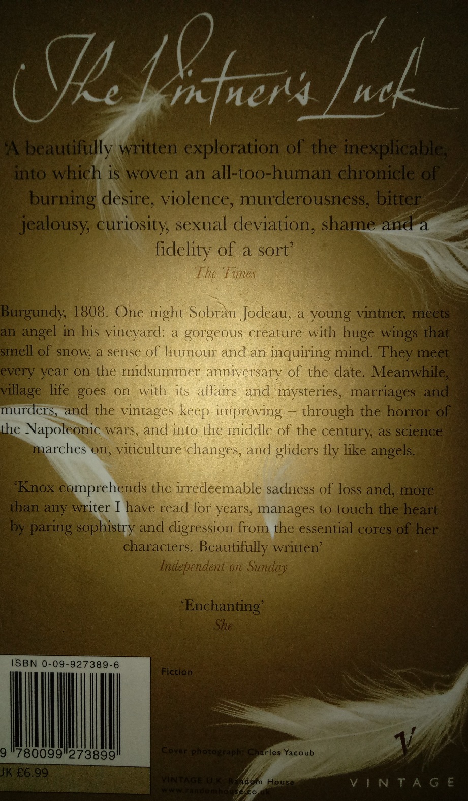 The fateful meeting between man and angel occurs on June 27. After an evening during which Sobran spills all his troubles and Xas gently advises him, the angel promises to return on the same night next year to toast Sobran’s marriage. Thus begins a friendship that will last for 55 years, spanning marriages, wars, births, deaths, and even the vast distances between heaven, earth, and hell. In addition to the wonderfully flawed Sobran and his mysterious angel, Knox brilliantly limns secondary characters who are deeply sympathetic–from Sobran’s unstable wife, Celeste, and his troubled brother, Leon, to his dear friend and confidante, the Baroness Aurora. Love, murder, madness, and a singular theology that would make a believer out of the most hardened atheist all add up, in The Vintner’s Luck, to a novel that will break your heart yet leave you wishing for more. –Alix Wilber