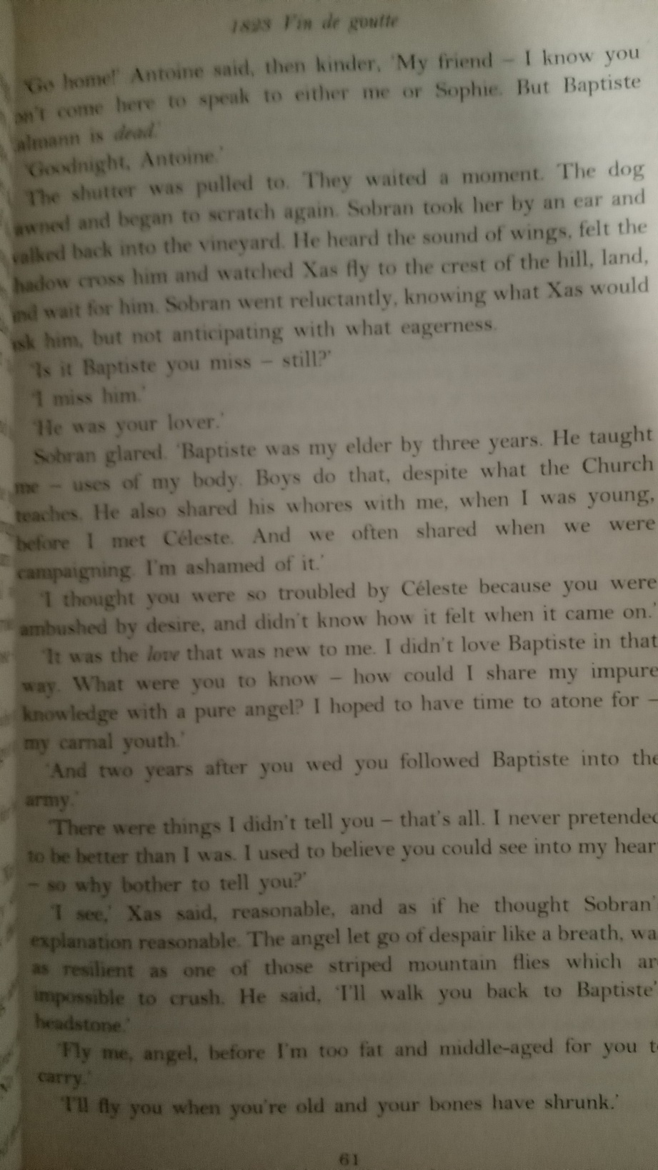 The year is 1808, the place Burgundy, France. Among the lush vines of his family’s vineyard, Jodeau, 18 years old and frustrated in love, is about to come face to face with a celestial being. But this is no sentimental “Touched by an Angel” seraph; as imagined by Elizabeth Knox in her wildly evocative and original novel, Xas is equipped with a glorious pair of wings (“pure sinew and bone under a cushion of feathers”) and an appetite for earthly pleasures–wine, books, gardening, conversation, and, eventually, carnal love.