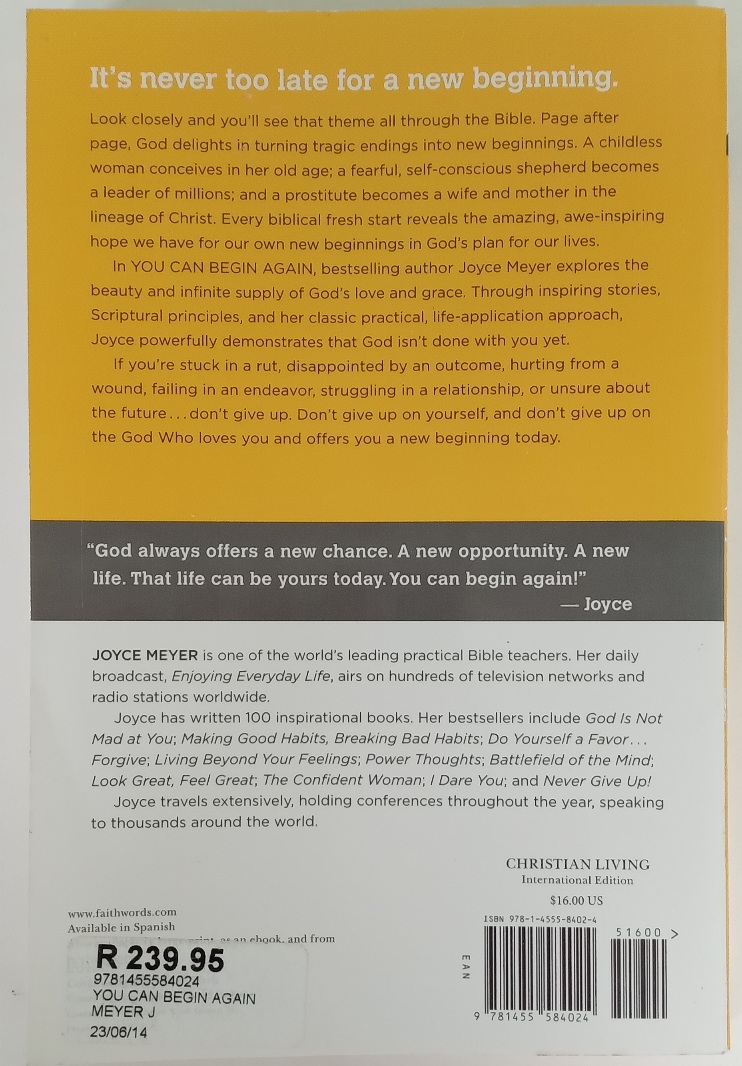 In You Can Begin Again, bestselling author Joyce Meyer explores the beauty and infinite supply of God’s love and grace. Through inspiring stories, Scriptural principles, and her classic practical, life-application approach, Joyce powerfully demonstrates that God isn’t done with you yet.